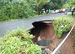 The National Weather Service (NWS) office in Guam released a Special Weather Statement for Pohnpei and Kosrae due to the potential of flash floods and landslides, stating that the system had already produced almost 180 mm (7 in) of rainfall over the islands.[2] The precursor disturbance to Jelawat passed slowly through Pohnpei, yielding a total 537 mm (21.15 in) of rainfall on parts of the island on March 16–17, resulting in flooding and 24 landslides; one of the landslides killed a person and seriously injured another. The downpour along with high waves inundated and damaged roads,[29][30] likewise to overflowing rivers. Eleven bridges and culverts were damaged, and throughout the events, a landslide warning and six flood statements were announced by the island's local Weather Service Office.[30] A number of homes were flooded in every municipality on the island.[31] Nearly 250 houses were either damaged or destroyed, and critical damage was done to infrastructure as a result of the heavy rainfall.[32]