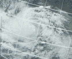 An aerial reconnaissance crew (similar to Hurricane Hunters) sent to investigate Joan on October 13 encountered severe turbulence and a g-force reading of 2.5 gs[1] as the storm was at its peak. The readings sent back put Joan with 150 knot (280 km/h or 175 mph) winds and a minimum central pressure of 905 mb.