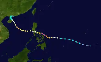 Typhoon Joan, known in the Philippines as Super Typhoon Sening,[2] was the first of two super typhoons to strike the Philippines within a week in October 1970, the second being Super Typhoon Kate. Typhoon Joan is the fourth strongest typhoon[3] ever to affect the Philippines, just after typhoons Haiyan in 2013, Meranti in 2016, and Goni in 2020.