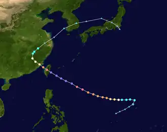 Typhoon Joan was an intense typhoon that caused minor damages in relative to the strength of the typhoon. Joan was the strongest typhoon of 1959 Pacific typhoon season, and one of the most intense Pacific typhoons on record. Joan formed from a surface center to the northeast of Guam on August 23, in which Japan Meteorological Agency began to track and classify the system as a tropical depression on the next day. A reconnaissance aircraft was sent to investigate the surface center and in 03:25 UTC on August 25 the surface center was classified as a tropical storm by Joint Typhoon Warning Center. The storm rapidly intensified into a typhoon in the same day it was formed. By the next three days as Joan tracks towards Taiwan, Joan explosively intensified to attain peak intensity with the pressure of 885 millibars (26.1 inHg), which is tied with Nina as the most intense Pacific typhoon on the record at the time.[1] Shortly afterwards, Joan attained peak strength as a Category 5 equivalent super typhoon on the Saffir–Simpson hurricane scale with winds of 165 knots (190 mph) before making landfall in Taiwan as a 160 knots (180 mph) typhoon, which was according to JTWC is the strongest landfall in the recorded history at the time. After making landfall, Joan weakened into a 110 knots (130 mph) typhoon before making landfall on Fujian, China as a Category 2 equivalent typhoon on the Saffir–Simpson hurricane scale with winds of 95 knots (109 mph). Once onshore, Joan did not degenerate quickly as Joan remained as a tropical cyclone for about one day before transitioning into a extratropical cyclone in 18:00 UTC of August 31. Extratropical remnants of Joan quickly traversed through South Korea and Japan before being last noted on 18:00 UTC, September 2.