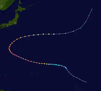 While near peak intensity on October 17, Joan was located about 2,100 km (1,300 mi) east of Typhoon Ivan, which had also reached super typhoon status; the JTWC later noted that it was "the first observation of two tropical cyclones of such extreme intensity existing simultaneously in the Northwest Pacific." Despite the proximity to Ivan, the two typhoons did not undergo the Fujiwhara effect. The JTWC estimated that Joan weakened slightly after reaching peak winds,[2] although the JMA maintained the typhoon at peak intensity for nearly three whole days.[4] Joan gradually turned more to the northwest, passing between Anatahan and Saipan in the Northern Marianas Islands (NMI) on October 18.[2] On October 20, the JMA estimated that the typhoon began weakening,[4] and on the same day Joan turned sharply to the north. On the next day, Joan weakened below super typhoon intensity for the first time in 4.5 days, a record at the time based on JTWC analysis.[2] This record was later surpassed by Typhoon Fengshen in 2002 and Typhoon Ioke in 2006.[6][7] By October 21, the typhoon had accelerated to the east and was quickly weakening.[2] The next day, Joan passed about 230 km (140 mi) north of the Japanese island of Iwo Jima.[8] On October 24, the typhoon turned to the northeast while losing tropical characteristics,[2] and that day the JMA ceased tracking Joan.[4] The JTWC declared the typhoon as extratropical on October 25 around the same time it crossed the International Date Line.[2] Former Typhoon Joan merged with a cold front and re-intensified while approaching the Aleutian Islands, and was noted by the Mariners Weather Log as an extratropical storm on October 26.[9]