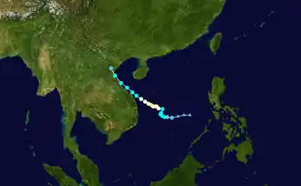 Typhoon Kai-Tak was first noted as an area of convection to the west-southwest of Manila, Philippines.[1] Under favorable conditions, the disturbance continued to develop, prompting the JTWC to issue a TCFA to the system at 09:30 UTC on October 28.[1] The JMA followed suit and recognized the system as a tropical depression on the same day. It intensified to a tropical storm on the next day, earning the name Kai-tak.[2] Moving on an environment between two ridges, the tropical storm continued to intensify, becoming a typhoon on October 30.[1] It rapidly intensified, becoming a Category 2 typhoon on the same day, before subsequently weakening due to unfavorable conditions and the land interaction on Vietnam.[2] It was downgraded to a tropical storm on November 1, before making landfall near Thanh Hóa on the next day. It rapidly degraded over the mountainous terrain of Vietnam, before it was last noted on November 2, near Laos.[3]