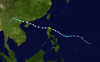 On September 10, a tropical disturbance formed northeast of Palau with a possibility of becoming a tropical cyclone in the next few days.[1] Later the same day, the JTWC had reported that it had intensified into a tropical depression, giving it the designation "15W". Early on September 12, the JMA started to track 15W as a tropical depression. In the same time, PAGASA had issued their first advisories on the storm, naming it as Tropical Depression Luis.[2][3] As Luis entered a more conducive environment, it steadily intensified into a tropical storm and was named Kalmaegi by the JMA later that day and the JTWC followed suit on the same day.[4] The storm entered an area of warm waters as the JMA upgraded it to a typhoon, while JTWC upgraded it to a category 1 typhoon late on September 13. Kalmaegi made landfall over Cagayan early the next day, as it start to interact with land and weakened to a tropical storm. On September 15, Kalmaegi entered the South China Sea and intensified again.[5] The typhoon reached its peak strength while making its second landfall over Hainan Island.[6] Kalmaegi rapidly weakened to a large tropical storm as it continued to move in a westward direction. Both agencies classified Kalmaegi as a tropical depression. Later that day, both agencies announced that Kalmaegi had dissipated.[7]