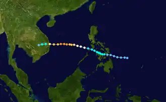 Typhoon Lingling, known in the Philippines as Typhoon Nanang, was a deadly typhoon that struck the Philippines and Vietnam in early-November 2001 and caused 379 deaths. The name "Lingling" was given by Hong Kong.[1] The 39th tropical depression, 22nd named storm, and 13th typhoon of the 2001 Pacific typhoon season, Lingling developed into a tropical depression on November 6 and given the local name Nanang by the PAGASA. The next day, it was upgraded into a tropical storm and given the name Lingling by the Japan Meteorological Agency (JMA). Lingling's intensity briefly stagnated as it moved over Visayas before resuming intensification and intensifying into a severe tropical storm on November 8. One day later, both the JMA and the Joint Typhoon Warning Center (JTWC) upgraded Lingling to a typhoon as it exited the Philippine archipelago and moved into the South China Sea. After intensifying into a typhoon, Lingling began to quickly intensify, peaking with 10-min sustained winds of 155 km/h (96 mph) and 1-min sustained winds of 215 km/h (134 mph), with a minimum central pressure of 940 mbar (28 inHg). Lingling began to weaken as it approached the Vietnamese coast, before making landfall on November 11 at 18:00 UTC. Lingling rapidly weakened afterward, dissipating on November 12.