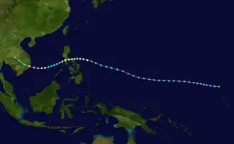 The precursor to Lola formed from an active near-equatorial trough that produced 2 other typhoons. On November 27 at 6:00 UTC, the Joint Typhoon Warning Center (JTWC) began monitoring an area of convection situated near the western Marshall Islands. On December 1 at 4:00 UTC, the JTWC issued a Tropical Cyclone Formation Alert (TCFA) due to a consolidation of convection near the center.[2] Hours later at 6:00 UTC, the Japan Meteorological Agency (JMA) began issuing advisories on a tropical depression about 950 km south-southeast of Guam.[3][4] The same day at 19:00 UTC, the JTWC issued another TCFA as it moved out of the previous TCFA area. On December 2 at 0:00 UTC, the JTWC issued its first warning on Tropical Depression 35W due to increased convective organization.[2] The same day at 18:00 UTC, the JMA upgraded the depression to a tropical storm, with the JTWC doing so later at 0:00 UTC on December 3, giving it the name Lola. At 12:00 UTC the same day, the JMA upgraded Lola to a severe tropical storm. Lola continued intensifying, and on December 4 at 6:00 UTC, the JTWC upgraded Lola to a typhoon due to the appearance of an eye.[2][3] After intensifying into a typhoon, Lola turned westward, before reaching its initial peak intensity of 150 km/h (95 mph) on December 5 at 6:00 UTC according to the JTWC, with the JMA assessing that it had peaked in intensity at the same time, with a minimum central pressure of 955 hPa. Approximately 6 hours later, Lola made landfall near the municipality of Vinzons.[5][3] Lola took a west-southwestward track as it passed over the Philippines and south of Manila, weakening into a severe tropical storm in the process. Lola re-emerged over the South China Sea on December 6.[4][6] On December 8 at 0:00 UTC, both the JMA and the JTWC upgraded Lola to a typhoon for a second time due to a satellite intensity estimate.[2][3] As Lola began turning west-northwestward, Lola began to quickly intensify, reaching Category 2 status 6 hours later. On the same day at 12:00 UTC, the JTWC assessed that it had peaked in intensity, with 1-min winds of 195 km/h (120 mph).[5] 6 hours later, Lola made its final landfall near the city of Cam Ranh as a high-end Category 2-equivalent storm.[5] The lowest sea level pressure recorded in Nha Trang (Khánh Hoà) during the typhoon was 999.4 hPa (29.51 inHg).[7] Lola rapidly weakened over land, before both the JMA and the JTWC issued their final warnings on the system at 6:00 UTC on December 9.[2][3] Lola dissipated over Cambodia later that day.[6]