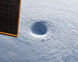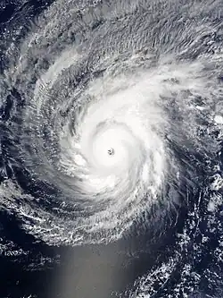 On March 28, microwave satellite imagery revealed an eye with central dense overcast obscuring most of the feature;[10] accordingly, the JMA upgraded Maysak to a severe tropical storm.[6] The storm continued to strengthen while moving westward along the periphery of a subtropical ridge,[10] The eye became more defined and the convection became more consolidated.[11] Early on March 29, the JMA upgraded Maysak further to typhoon status, estimating 10 minute winds of 120 km/h (75 mph).[6] That day, the typhoon moved over Chuuk Lagoon, the first time an eye crossed the lagoon since Typhoon Amy in 1971.[12][13] The storm developed good outflow, enhanced by a strong northerly flow,[14] although moderate wind shear kept Maysak from intensifying more quickly.[15] However, the eye became clearly visible on March 30,[16] and the typhoon rapidly intensified after the shear diminished.[17] The JTWC reported a 30 km (19 mi) wide eye displaying the stadium effect, and surrounded by very deep convection. On March 31, the agency assessed that Maysak intensified into a Category 5-equivalent super typhoon on the SSHWS, with 1-minute sustained winds of 260 km/h (160 mph); this was increased to 280 km/h (175 mph) in post-season reanalysis, the highest on record for a pre-April typhoon.[18] Around that time, the storm was moving through the Federated States of Micronesia (FSM), passing just north of Fais Island,[19] and also very near Ulithi.[18] Late on March 31, Maysak reached its peak intensity, and the JMA estimated peak winds of 195 km/h (120 mph) and a minimum pressure of 910 mbar (27 inHg),[6] although operationally, the agency had estimated that Maysak was slightly more intense.[20] This made Maysak the most powerful typhoon ever recorded before April, surpassing Typhoon Mitag of 2002, Typhoon Alice of 1979, and Typhoon Harriet of 1959.[18]
