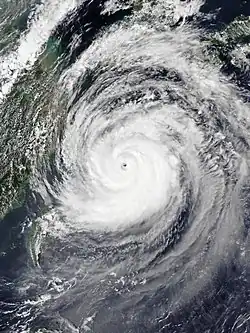 On August 30, Maysak's structure became indicative of an impending phase of rapid intensification according to the JTWC.[17] The typhoon developed a central dense overcast that day with an eye embedded within.[18] An approaching trough over eastern China and western Japan caused Maysak to accelerate towards the north as it continued to traverse energetic ocean waters.[19] The typhoon's eye became symmetric and spanned 55 km (34 mi) across.[20] By 21:00 UTC, the eye had contracted to a diameter of 19 km (12 mi). Around that time, the JTWC assessed the typhoon as having one-minute sustained winds of 215 km/h (134 mph).[21] At 00:00 UTC on September 1, the JMA determined that Maysak had ten-minute maximum sustained winds of 110 mph (180 km/h) with gusts of up to 250 km/h (160 mph). The associated barometric pressure was estimated at 935 hPa (mbar; 27.61 inHg).[22][23] Maysak held this intensity as it began to move into a less conducive environment for storm development within the East China Sea.[24] Soon, Maysak began to weaken steadily as it passed the East China Sea, slowing back down to a Category 3 storm. The storm then made landfall near Busan, South Korea at 02:20 KST on September 3 (17:20 UTC on September 2), with 10-minute maximum sustained winds at 155 km/h (96 mph) and the central pressure at 950 hPa[25] equivalent into a Category 2 typhoon. After that, it crossed the Sea of Japan and hitting North Korea into Jilin in northeast China. Soon after, Typhoon Maysak transitioned into an extratropical low in northeast China.[26]