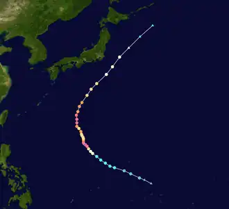 On September 21, the Joint Typhoon Warning Center spotted an area of convection formed approximately 703 nmi (1,302 km; 809 mi) southeast of Guam.[5] The system rapidly consolidated itself and formed a well-defined LLCC,[6] and thus, the system strengthened into a tropical depression on 00:00 UTC of September 22.[7] The JTWC did the same later that day, designating the system as 20W.[8] At 09:00 UTC of September 23, the JTWC upgraded it to a tropical storm, as its low-level circulation center became partially exposed.[9] The Japan Meteorological Agency did the same three hours later, and named it Mindulle.[10] At 12:00 UTC of September 24, the JMA upgraded it to a severe tropical storm.[11] By 03:00 UTC the next day, the JTWC upgraded it to a Category 1-equivalent typhoon, as it developed a small eye. The presence of dry air had slowed its intensification, but it still managed to become a typhoon.[12][13] Mindulle started to rapidly intensify as it quickly intensified into a Category 2-equivalent typhoon. Its eye expanded but became ragged due to the presence of dry air.[14] Mindulle continued its rapid intensification, as it further intensified into a Category 4-equivalent typhoon at 15:00 UTC. Mindulle's eye became well-defined and at 03:00 UTC the next day, it became a Category 5-equivalent super typhoon, making it the third super typhoon of this season. Satellite imagery showed that the typhoon had developed a well defined 15 nmi (28 km; 17 mi) eye and deepening of the central core.[15] At 15:00 UTC, Mindulle weakened into a Category 4-equivalent super typhoon as the eye and the convective structure started to degrade. It also underwent an eyewall replacement cycle, as it developed another eyewall.[16] At 03:00 UTC of September 27, the JTWC further downgraded the system to a Category 3-equivalent typhoon,[17] and six hours later, the agency had further downgraded it to a Category 2-equivalent typhoon because of the effects of the eyewall replacement cycle and the increasing presence of dry air.[18] At 15:00 UTC of September 28, Mindulle re-intensified into a Category 3-equivalent typhoon, as it moved over favorable conditions. Satellite imagery showed that the typhoon continued to struggle to intensify. Its 20 nmi (37 km; 23 mi) eye had steadily shrunk but it remained cloud covered and ragged.[19] By the next day at 03:00 UTC, the JTWC re-upgraded it to a Category 4-equivalent typhoon as the eye cleared out again.[20] At 21:00 UTC of September 29, it rapidly weakened and by 15:00 UTC the next day, it weakened from a Category 3-equivalent typhoon to a Category 1-equivalent typhoon. Cool dry air and cool sea-surface temperatures were responsible for the weakening.[21][22][23] At 21:00 UTC of October 1, the JTWC issued its final warning as it downgraded to a tropical storm.[24] Three hours later, JMA also issued its final warning, as it became extratropical cyclone, off the coast of Hokkaido.[25] The storm continued northeast towards Alaska until losing its identity.