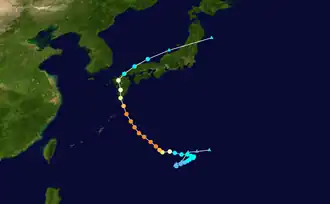 The JMA estimating a minimum central pressure of 910 hPa (26.87 inHg).[24] Nanmadol entered the Philippine Area of Responsibility, and was named Josie before eventually exiting 5 hours later.[25] Multispectral animated satellite imagery revealed a 21 nautical miles (39 km; 24 mi) surrounded eye around a deep convection.[26] The next day, Nanmadol weakened back to a Category 4-equivalent typhoon.[27] Satellite imagery revealed a rapid weakening on the system.[28] At 03:00 UTC on September 18, the JTWC further downgraded it to a Category 3-equivalent typhoon.[29] Nanmadol weakened further into a Category 2-equivalent typhoon as its structural strength began to rapidly deteriorate.[30] Nanmadol's were estimated at just 150 km/h (90 mph), which made it a Category 1-equivalent typhoon and made landfall over Southern Kyushu and a second landfall just south of Kagoshima around 18:00 UTC.[31][32] At 00:00 UTC on September 19, the JMA downgraded Nanmadol to a severe tropical storm.[33] The JTWC followed suit later that day, and declaring it tropical storm.[34] Satellite imagery revealed a swallowing convection shearing in the northeastwards.[35] At 21:00 UTC that day, the JTWC issued their final warning on the system.[36] The JMA issued its last advisory on Nanmadol, and declared it an extratropical low on September 20.[37]
