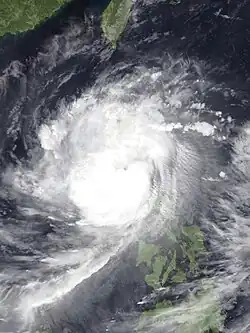 During October 9, PAGASA issued the public storm warning signal number 1 for the island province of Catanduanes, before expanding the areas under Signal 1 early the next day to include Aurora, Camarines Norte, Camarines Sur, Isabela, the Polillo Islands and Quezon.[9][10][11] Later that day after the system had intensified into a typhoon and accelerated slightly towards the Philippines slightly, PAGASA placed 17 areas in Luzon under Signal 1, 14 areas under Signal 2 and Aurora Province under Signal 3.[12] During October 11, the areas under signal 3 were expanded to include Benguet, Ifugao, Ilocos Sur, Isabela, La Union, Pangasinan, Polillo Island, Quirino, Nueva Ecija and Tarlac.[13] Over the next day, the warnings were gradually revised before they were all subsequently cancelled during October 12, as the system moved out of the Philippine Area of Responsibility and was moving towards Vietnam.[14][15]