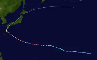 After maintaining peak intensity for 36 hours, Oliwa gradually weakened as it continued to the west-northwest, during which it passed through the Northern Marianas Islands. On September 14, the typhoon slowed to the north of Okinawa, and it turned to the northeast toward Japan.[4] As a weakened typhoon, Oliwa moved ashore on Makurazaki, Kagoshima, Kyushu with winds of 85 mph (137 km/h) late on September 15. It weakened to tropical storm strength while crossing Japan, and deteriorated further to tropical depression status on September 16.[3] On September 17, the JTWC issued the final advisory on Oliwa while it was in the eastern portion of the Sea of Japan.[4] The JMA maintained advisories as the storm crossed northern Japan, and it accelerated over the open Pacific Ocean. On September 19, Oliwa dissipated near the International Date Line to the south of the Aleutian Islands.[3]