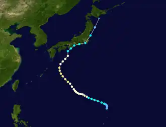 On August 13, the Japan Meteorological Agency started to track a tropical depression that was embedded to the monsoon to the north-northwest of Saipan. Due to its rapid development, the Joint Typhoon Warning Center issued a Tropical Cyclone Formation Alert. The JTWC began issuing advisories; thereafter, giving the designation of 14W. All agencies upgraded 14W to a tropical storm the next day, after satellite imagery depicted a well-defined Low-level Circulation Center along with gale-force winds to the south of it. The JMA gave the storm the name Pabuk. Moving northwestward, Pabuk gradually intensified, and the JTWC upgraded the system to a typhoon on August 15; the JMA did the same 24 hours later. By August 17, Pabuk briefly reached its initial peak strength as a low-end Category 2 typhoon as it moved west-northwest[3] before slowly weakening. During the next day, Pabuk began to re-intensify as a banding eye feature began to develop. Satellite animated imagery showed an eyewall forming with deep convection. By 06:00 UTC of August 19, Pabuk reached its second peak intensity with 1-minute sustained winds of 165 km/h (105 mph). The typhoon grew in size, and its eye became irregular, hinting on a weakening trend[4] while moving north northeastward. Pabuk weakened to tropical storm intensity when it hit the southern coast of Japan, south of Osaka, on 12:00 UTC of August 21.[5] On August 22, both the JMA and the JTWC issued its final advisory after it became extratropical.[1]