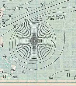 On October 26, a tropical cyclone formed east of the Philippines, having a minimum pressure of 1,006 hPa (29.7 inHg).[1] Early the next day, the Fleet Weather Center (FWC) began tracking the cyclone, which had intensified into a tropical storm, naming it Pamela.[2] The JMA followed suit the next day, noting that it had intensified into a tropical storm[3] and deepened to have a minimum pressure of 998 hPa (29.5 inHg).[1] Intensifying further, on October 30, both the FWC and JMA noted that Pamela had rapidly intensified into a typhoon.[2][4]
