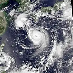![]() Typhoon Pat (middle) during its Fujiwhara interactions with Odessa (left) and Ruby (top-right) on August 30 | |