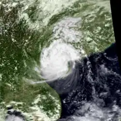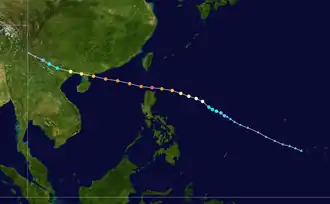 Tracking north-northwestward, Sally attained typhoon intensity by 0600 UTC on 6 September.[1] At the time, the typhoon had a minimum barometric pressure of 990 mbar (hPa; 29.24 inHg) according to the Japan Meteorological Agency (JMA). Rapid intensification followed shortly afterwards, with the typhoon reaching the equivalent of Category 3 intensity by 0600 UTC on 7 September.[3] Ten hours later, the JTWC upgraded Sally to super typhoon status.[nb 1] At 1800 UTC, the JTWC assessed Sally to have peaked in strength with maximum sustained winds of 260 km/h (160 mph), equivalent to that of a Category 5 tropical cyclone on the Saffir–Simpson hurricane wind scale.[1] The JMA estimated the storm's minimum pressure at the time to be at 950 mbar (950 hPa; 28 inHg).[3] The following morning,[2] Sally accelerated into the South China Sea under the influence of a strong subtropical ridge to the north. Despite its movement over waters, the typhoon steadily weakened as it tracked westward.[1] On 9 September,[2] Sally made landfall on China's Leizhou Peninsula with winds of 185 km/h (115 mph). The typhoon briefly tracked over the Gulf of Tonkin before making a second and final landfall just north of the border between China and Vietnam. Upon moving inland, Sally quickly weakened before dissipating over southwestern China on 9 September.[1]