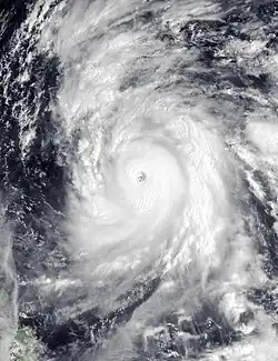 As wind shear decreased, Sanba continued to strengthen as it moved northwestward.[9] At 06:00 UTC on September 12, the JMA upgraded Sanba to a severe tropical storm.[10] Six hours later, Sanba intensified into a typhoon, as it formed a pinhole eye.[10][11] The system then started its rapid intensification, becoming a Category 2-equivalent typhoon on the Saffir-Simpson scale at 03:00 UTC on the next day,[12] before becoming a Category 4-equivalent typhoon six hours later, with a 18 nmi (33 km) eye present on satellite imagery. This was owed to the favorable environment the storm was in, with 29–30 °C (84–86 °F) sea surface temperatures, low wind shear, radial outflow, an excellent poleward outflow being enhanced by a tropical upper tropospheric trough (TUTT) to the northwest, as well as a subtropical low southeast of Honshu, and an equatorial channel.[13] Sanba ultimately reached its peak intensity at 18:00 UTC that same day, with 10-minute sustained winds of 110 knots (205 km/h; 125 mph) and a central pressure of 900 hectopascals (27 inHg), according to the JMA.[14] The JTWC estimated Sanba to have 1-minute sustained winds of 155 knots (285 km/h; 180 mph), making the storm a Category 5-equivalent super typhoon.[10]