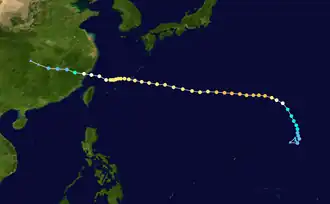 Shortly after Sinlaku become a typhoon, the JMA estimated it attained peak 10 minute maximum sustained winds of 150 km/h (93 mph).[3] Also on August 31, the JTWC estimated peak 1 minute winds of 205 km/h (127 mph).[4] On September 1, Sinlaku began undergoing an eyewall replacement cycle, although cooler water temperatures caused by previous Typhoon Rusa prevented restrengthening.[2] The typhoon turned more to the west-northwest on September 2, and without much change in intensity, it passed just south of Iwo Jima that day and very near the Japanese island of Minamidaitojima around 2130 UTC on September 3. The next day, Sinlaku also passed just south of Okinawa Island,[3] although its large 110 km (68 mi) eye crossed over the southern portion of the island; the JTWC estimated the storm had winds of 175 km/h (109 mph) while passing near Okinawa.[4] A trough passing north of Sinlaku slowed the typhoon's westward movement. Dry air in the region,[2] and later increased wind shear caused a steady weakening trend. On September 6, Sinlaku passed a short distance north of Taiwan,[4] and subsequently a west-northwest motion resumed.[2] The JMA downgraded the typhoon to a severe tropical storm on September 7 in the East China Sea,[3] although the JTWC maintained it as a typhoon.[4] Around 1030 UTC that day, Sinlaku made landfall in east-central China near Wenzhou, a city near the border of Zhejiang and Fujian provinces.[2] The storm weakened while progressing inland, although its circulation remained well-defined until dissipating on September 9.[3][4][2]