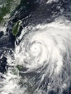 Early on September 9 the JMA upgraded Sinlaku to a Severe Tropical Storm.[12] Whilst during that afternoon the JTWC reported that Sinlaku had intensified into a Typhoon, the JMA then upgraded Sinlaku to a typhoon later that day.[13][14] The JTWC then reported Sinlaku had intensified into a category two typhoon. During the next day Sinlaku continued to intensify and reached its maximum 1 minute sustained winds of 125 knots which made it a Category 4 typhoon. It stayed at this intensity until the next day when it started to weaken as it went through an eye wall replacement cycle. Sinlaku then struggled to come out of its eye wall replacement cycle and as a result weakened into a Category 3 typhoon. The weakening trend continued until on September 13 Typhoon Sinlaku made landfall on Taiwan as a Category 2 typhoon. It moved towards the North West through Taiwan and then turned towards the north east and moved back into the South China Sea and started moving slowly towards Japan.