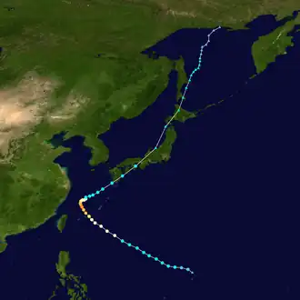In the early morning hours of September 10, the JMA upgraded the system to a typhoon, with a small eye emerging on the system.[10] Its eye became apparent on satellite images later that day,[11] before Talim entered the Philippine Area of Responsibility, with the PAGASA issuing on their first bulletin, classifying the system as Typhoon Lannie.[12][13] It passed over the Ryukyu Islands on September 13 as it continued to move to the northwest.[14] Also at that time, Lannie exited the PAR, with the PAGASA issuing their final advisory on the system.[15][16] Talim reached its peak strength the next day, with sustained winds of about 140 mph (230 km/h) for one minute mean and a minimum pressure of 935 mbar (27.61 inHg).[17] At this time, the typhoon's wind field expanded as far as Shanghai and it featured a large eye.[11] On September 15, Talim began to weaken due to increasing upper-level wind shear, with the typhoon becoming slowly disorganized.[18][19] It further degraded to a tropical storm as it slowly approached the Japanese Islands, before making landfall near Kyushu on September 17.[20][21] It crossed the country, before transitioning to an extratropical storm as it entered the Sea of Japan, near Hokkaido on the next day,[22] following with the JTWC and JMA issuing their final warning.[3] It soon hit Sakhalin as a gale-force extratropical storm later that day.[22] The extratropical remnants persisted for four more days before dissipating on September 22, just offshore Magadan Oblast.[3]