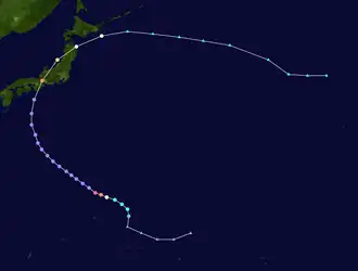 Vera developed on September 20 between Guam and Chuuk State, and initially tracked westward before taking a more northerly course, reaching tropical storm strength the following day. By this point Vera had assumed a more westerly direction of movement and had begun to rapidly intensify, and reached its peak intensity on September 23 with maximum sustained winds equivalent to that of a modern-day Category 5 hurricane. With little change in strength, Vera curved and accelerated northward, resulting in a landfall on September 26 near Shionomisaki on Honshu. Atmospheric wind patterns caused the typhoon to briefly emerge into the Sea of Japan before recurving eastward and moving ashore Honshu for a second time. Movement over land greatly weakened Vera, and after reentering the North Pacific Ocean later that day, Vera transitioned into an extratropical cyclone on September 27; these remnants continued to persist for an additional two days.