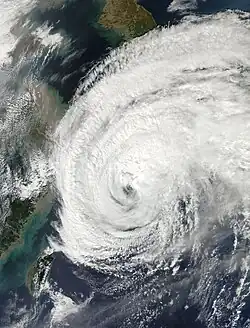 Maintaining peak intensity for over one day, Vongfong began to gradually weaken on October 9, because of an eyewall replacement cycle.[9] On October 10, the structure of the typhoon decayed more, and it totally lost its eye feature on the next day when passing through Okinawa.[10] Due to mid-latitude westerlies, Vongfong's low-level circulation center became partially exposed. The typhoon accelerated east-northeastward on October 12 and made landfall over Kyushu.[11][12] The system continued passing through the main islands of Japan and weakened into a severe tropical storm on October 13, before it became extratropical on October 14.[13][14]
