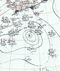 Typhoon Wilda was an intense typhoon that was tied for lowest central pressure of any typhoon in 1964, along with Typhoon Sally.[1] As the twenty-fourth named storm of the season, it origins can be traced back to when it was as a tropical storm east-southeast of Guam on September 16. Wilda moved northwestward for multiple days. it was identified as a tropical storm by Joint Typhoon Warning Center on September 19, strengthening into a typhoon that day. It reached its peak intensity over the Philippine Sea. Wilda slightly weakened following peak strength before curving northward and making landfall on September 24. The storm would eventually emerge into the Sea of Japan and curve northeast. Wilda made a final landfall on September 25 as a tropical storm, thereafter, departing Japan and quickly moving towards the central Aleutian Islands as a powerful extratropical cyclone, dissipating on September 27.