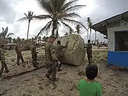 The damage assessment took place from March 18 to April 4, with assistance from the IOM. It found along with infrastructure damage, that agriculture production was damaged across 30 islands, leaving 11,575 people food insecure. Shipments containing rice, vegetables, and cooking oil were sent to the Mortlock Islands of Chuuk State. Approximately $450,000 from USAID's Office of Foreign Disaster Assistance, New Zealand Embassy, and Australian Aid, was mobilized to contribute efforts and for purchasing food baskets, aiding 9,295 people and the other 2,280 who suffered moderate crop damage.[65] On March 31, a multinational team aboard USNS Brunswick arrived at the Lower Mortlock Islands to support recovery efforts as part of Pacific Partnership 2019.[66] Because of their Compact of Free Association between the national governments, U.S. President Donald Trump declared Wutip a disaster on May 7, making funding for emergency relief and reconstruction assistance available, after Christian had requested a disaster declaration on April 17.[67] With this funding, the Catholic Relief Services provided agricultural rehabilitation and the IOM gave food assistance to the areas affected by Wutip. The USAID division in the Philippines reconstructed 136 homes and 39 public structures. Relief and reconstruction funding from USAID totaled more than $22.3 million.[64]