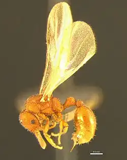 The paratype gyne is 3.98 mm (0.16 in) long. The head is wide along the rear margin narrows towards the front and the sides and rear are convex. The central area of the rear margin has a slight concave indent. The antennae have eleven segments the three apical ones forming a weak club. The scape extends from the antenna socket almost to the rear margin of the head. Unlike the workers, the eyes of the gyne are composed of more than 100 ommatidia and form about 40% of the convexity on each side of the head.[1] The mandibles are generally triangular in outline, with an angle separating the chewing margin from the basal margin. There are only two teeth present, the longer apical tooth and the shorter, duller pre-apical tooth. After the two teeth, the rest of the interior margin, both chewing and basal, are toothless.[1]