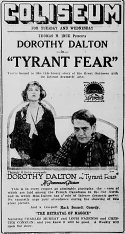 Tyrant Fear is a 1918 American silent drama film directed by Roy William Neill, written by R. Cecil Smith, and starring Dorothy Dalton, Thurston Hall, Melbourne MacDowell, William Conklin, Lou Salter, and Carmen Phillips. It was released on April 29, 1918, by Paramount Pictures.[1][2] A print of the film is held by the Library of Congress.[3][4]