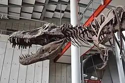 Other exhibits that display specimens from the museum's fossil collection includes the Dinosaur Hall, Fossils in Focus, and Triassic Giants.[21] Dinosaur Hall houses over thirty mounted dinosaur skeletons including specimens of an Albertosaurus, Camarasaurus, Triceratops, and a Tyrannosaurus, including Black Beauty, the fourteenth-most complete skeleton of a Tyrannosaurus in the world.[8][28] Fossils in Focus is an exhibit that typically displays specimens of interest for the museum's research program.[29] Triassic Giants is an exhibit dedicated to Elizabeth Nicholls, the museum's former curator of marine reptiles, and houses a specimen of a Shonisaurus, the world's largest marine reptile.[30]