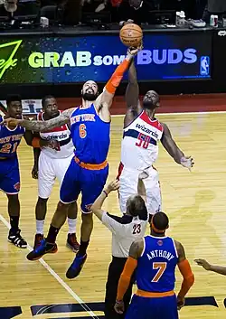 In January 2013, Chandler was named an NBA All-Star for the first time in his 12-year career, earning selection as an Eastern Conference reserve for the 2013 NBA All-Star Game.[38] In early February, he tied a franchise record with three straight 20-rebound games, becoming the first Knicks player to have 20 in three straight games since Willis Reed in December 1969.[39] On February 27, he had 16 points and a career-best 28 rebounds in a 109–105 win over the Golden State Warriors.[40] In May 2013, he was named in the NBA All-Defensive First Team, becoming the first Knicks player to earn first-team honors since Charles Oakley in 1994.[41]