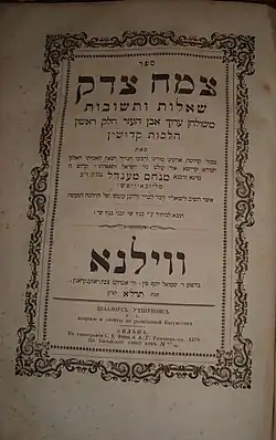 - ^ "Tzemach" (צמח) has the same gematria as "Menachem" (מנחם), and "Tzedek" (צדק) has the same as "Mendel" (מענדל). The original responsa Tzemach Tzedek were those of Menachem Mendel Krochmal. Schneersohn's responsa are known as Shu"t Tzemach Tzedek Hachadashot, "the new Tzemach Tzedek responsa". Rabbi Menachem Mendil Hager, the first Viznhitzer Rebbe, called his commentary on the Torah Tzemach Tzadik (צמח צדיק), because he spelled his name with an extra yod (מענדיל).