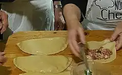 It is a type of calzone, originating in the 18th and 19th centuries.[1] By tradition, pastizz was prepared for particular events of the year (pig slaughter, Easter, and the celebration of Saint Mary of Anglona), when the availability of meat was increased. The half-moon shape is linked to a symbolism that refers to the concepts of female fertility and prosperity, and recalls that of a large womb that holds nutritious elements.[1]