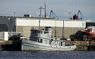 U.S. Army ST-488 is an 86 ft (26 m) harbor tugboat, design 327-A, of the numerical series 885-490 built by J.K. Welding & Co shipyards in Brooklyn, New York in 1944. The Army's ST small tugs ranged generally from about 55 ft (17 m) to 92 ft (28 m) in length as opposed to the larger seagoing LT tugs.[4] ST-488 was delivered May 1944 and served in the United States Army from October 1944 to 1946 in the French port of Le Havre and on the floating docks of the U.S. Mulberry harbour of Arromanches in Normandy. After a civilian career at the port of Le Havre until the late 1970s, saved from wrecking by volunteers, she became a museum ship in 1994, part of Musée maritime of Le Havre and was classified a Monument historique (historical monument) in 1997.[5]