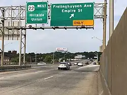 Past this interchange, the route comes to an exit for CR 630 before crossing the Elizabeth River into Hillside, where it heads east through more urban areas.[1][2] The road has an interchange at Bloy Street before passing over CR 509 and Conrail Shared Assets Operations (CSAO)'s Irvington Industrial Track line. After an interchange with Broad Street, US 22 turns northeast as a four-lane freeway.[1] It heads into Newark in Essex County, where the highway crosses under CSAO's Lehigh Line, which also carries NJ Transit's Raritan Valley Line, and passes through wooded Weequahic Park parallel to the railroad tracks. Past the park, US 22 turns to the east into urban areas and closely runs to the south of I-78, where it comes to an eastbound exit and westbound entrance for Empire Street, which provides access to Route 27.[1][2] A short distance later, the freeway has a direct westbound exit and eastbound entrance with Route 27.[1] Past this interchange, US 22 continues parallel to I-78, passing over Amtrak's Northeast Corridor before reaching the Newark Airport Interchange; south of Downtown Newark and northwest of Newark Liberty International Airport.[1][2] US 22 eastbound merges with US 1/9, with one southbound ramp and two northbound ramps (one for local and another for express lanes). The main line follows the US 1/9 local northbound ramp for another 0.4 miles (0.64 km), with an intermediate exit for Route 21. The official eastern terminus of US 22 is at the ramp split for I-78 and northbound US 1/9.[2][3]