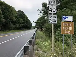 As traffic increased through the early 20th century, new roadway bypassed the original highways, with the old alignments receiving new monikers. With the construction of the Pulaski Highway east of Baltimore, the old alignment became MD 7.[12] By 1939, a bypass of Ellicott City had been constructed, signed as US 40 Bypass.[13] In 1948, the two alignments were swapped, with the old highway becoming US 40 Alternate,[14] and with the construction of a new freeway to Lisbon, both old alignments became part of MD 144.[15] By 1948, a new alignment had also been built from Frederick to Hagerstown, and the old alignment became the current US 40 Alternate. With the construction of I-70 and I-68, the existing segments of US 40 at freeway standards (the road from Frederick to Baltimore, the road west of Hancock, and the bypass of US 40 Scenic constructed in 1965) were incorporated into the new interstates. The sections of at-grade highway bypassed by I-68 had US 40 rerouted off of them onto the new interstate, with the section from Cumberland to Keyser's Gate becoming a new US 40 Alternate, with remaining sections becoming an extension of MD 144.