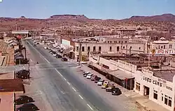 Construction of the bypass continued through late 1951 to the middle of 1952. By August 1952, construction on the bypass was winding down. By this point, 28 miles (45 km) had been completed with the final 17 miles (27 km) under construction.[64] The bypass was completed and opened to traffic on September 17, 1952.[71] The overall construction of the bypass from 1950 to 1952 was done at record speed at the time, being the fastest major highway construction project within the state's history.[64] US 66 was rerouted onto the new bypass, removing Oatman from US 66.[72] The new route ran along level ground close to the railroad, from Topock to Kingman through Yucca.[5] The bypassing of Oatman lead to the town's decline and near abandonment, while Yucca enjoyed a small period of increased success from US 66 traffic.[72] Oatman Highway remained an undesignated state highway until September 2, 1955, when it was completely transferred to Mohave County.[73]