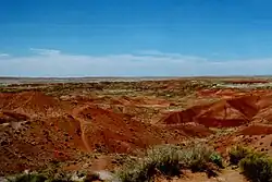 US 66 followed the south frontage road for 3.2 miles (5.1 km), then diagonally crossed I-40 onto a now-abandoned roadway through the Painted Desert, entering Apache County.[11][16] Within Petrified Forest National Park, US 66 met at a junction with SR 63, which acted as the main route through the southern end of the park. Today, SR 63 is no longer a state highway and is known as Petrified Forest Road.[2][16] US 66 continued northeast on the abandoned highway, which was located several miles north of I-40, through the heart of the Painted Desert. 7.3 miles (11.7 km) after the intersection with SR 63, US 66 arrived at the now-abandoned Painted Desert Trading Post. About 6.7 miles (10.8 km) northeast of the trading post, US 66 crossed over to the south side of I-40 onto County Route 7385. US 66 followed County Route 7385 around the Navajo Trading Post and McCarrell Memorial Cemetery to exit 330.[11][16]