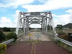 In the early days, National Old Trails Road traffic crossing the river utilized a ferry crossing between Topock and Needles on the California side of the river. The ferry, established in 1890, was used until 1914, when a river flood destroyed it. In response, the upstream Red Rock Bridge, owned by the Santa Fe Railway, became the new river crossing for National Old Trails Road motorists.[9] The railroad had allowed cars to use the bridge so long as the drivers were willing to pay a toll.[24] Construction started on the Old Trails Bridge, a dedicated automobile bridge, on June 30, 1915, and was completed several months later on February 20, 1916. The bridge was paid for by the states of California and Arizona as well as the Bureau of Indian Affairs at a cost of $75,000 (equivalent to $1.45 million in 2023[26]). The bridge itself was a steel arch structure designed by San Bernardino County surveyor S. A. Sourwine.[27] Once construction on the Old Trails Bridge had been completed, National Old Trails Road traffic was moved onto the new bridge and the Red Rock Bridge became train only once again.[9] From 1916 to 1928, the Old Trails Bridge held the record of being the longest three-hinged arch bridge in the United States.[9]