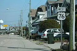 In 1936, US 74 and US 76 were adjusted in Leland, using a curve along Village Road to avoid an intersection with Lincoln Road and Post Office Road.[3][20] The abandoned route, roughly 0.14 miles (230 m)[23] became US 74-A. By 1942, US 76 was removed from its routing along Lumina Avenue north of Causeway Drive in Wrightsville Beach.[24][25] Instead, the highway was routed south, along Waynick Boulevard, Sunset Avenue, and South Lumina Avenue to end on the south side of Wrightsville Beach.[26] Between 1957 and 1962, US 76 was removed from Airlie Road between Oleander Drive and Wrightsville Avenue. The highway was rerouted north along Oleander Drive to Wrightsville Avenue. It then followed Wrightville Avenue to Wrightsville Beach where the road name changed to Causeway Drive.[21][27] In 1966, US 76 was placed onto split one-way streets along part of its routing in downtown Wilmington. The westbound lanes continued to use 17th Street between Dawson Street and Market Street, while the eastbound lanes were shifted to use 16th Street and Dawson Street.[28][29]