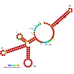 The 5' splice site region possesses sequence complementarity with the 5' splice site of the eukaryotic U12 type pre-mRNA introns. Both the 5' splice site and the Sm binding site are highly conserved in all species.[3] Also, stem loop III is either a possible protein binding site or a base-pairing region since it has a highly conserved nucleotide sequence 'AUCAAGA'.[3]