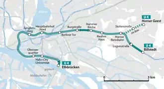 The U4 is a line of the Hamburg U-Bahn, which opened in 2012, serving 12 stations. It is the shortest line of the network, with a length of 11.9 kilometres (7.39 mi) and from Jungfernstieg to Billstedt it shares tracks with the U2.[1][2][3] Its identifying colour, as seen on route maps, trains, and station signs is turquoise.[4][5]