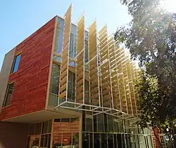 The Evelyn and Mo Ostin Music Center, completed in 2014, “includes a high-tech recording studio, spaces for rehearsal and teaching, a café and social space for students, and an Internet-based music production center.”[10] Paid for in part by a $10 million donation by Music Industry Executive and Philanthropist Morris “Mo” Ostin and his late wife, Evelyn Ostin, to his alma mater, the center was designed by LA-based architects Daly Genik Architects under the direction of principal Kevin Daly. The center was honored in 2016 at the 46th Annual Los Angeles Architectural Awards by Los Angeles Business Council.[10]