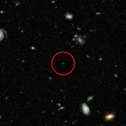 Its first known imaging was in Hubble Space Telescope's Hubble Ultra Deep Field, the most detailed deep space picture at that time.[2] The galaxy was observed in August and September 2009.[2][8] The image data was released to the scientific community, which led to the galaxy's detection by the teams of Bouwens,[1] Bunker[5] and McLure,[6] and subsequent spectroscopic campaign by the team of Lehnert and colleagues.