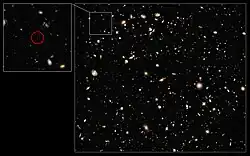 UDFy-38135539 (HUDF.YD3) is thought to be one of the first galaxies observed in the reionization epoch.[2] Caltech astronomer Brant Robertson, commenting on the study, stated that the "galaxy happens to reside at a very special time in cosmic history when the properties of gas in the universe were changing rapidly, and therefore this galaxy and others like it may teach us a lot about the early history of the universe".[13] Michele Trenti, an astronomer who was not involved in the study but provided commentary published with the report, says that the discovery of the distant galaxy represents a "fundamental leap forward in observational cosmology."[13]