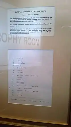 Rangers victory in the final has been heralded as one of the greatest achievements in the club's history. Sandy Jardine who played in the final placed the victory at the very top of the club's achievements.[9] The team that won the final became known as the Barcelona Bears.[10] In 2006 Rangers opened Bar 72 in the Govan stand which was named in honour of the team that won the Cup Winners Cup.[11] In 2012 Rangers celebrated 40 years since winning the trophy by wearing a 2012–13 home strip of a similar style as the one worn during the 1972 final.[12]