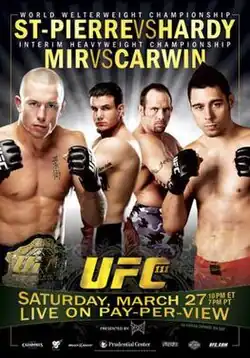 UFC 111: St-Pierre vs. Hardy was a mixed martial arts event held by the Ultimate Fighting Championship (UFC) on March 27, 2010, at the Prudential Center in Newark, New Jersey, United States.[3]