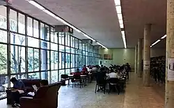 The campus has a residence complex for undergraduate students (504 rooms),[77] three university restaurants (commonly called "bandejões", or "big trays"),[78] a sports center, and banking agencies.[79] In 2010, there was the opening of an integration station for the unified college transport system, aiming for more security and comfort to the college community. Dozens of 24/7 inter-campus bus lines, free for students, are connected to the College City,[80] plus regular urban and intercity lines[81] serving the population of Baixada Fluminense region and of metropolitan Rio de Janeiro.[82][83][84]