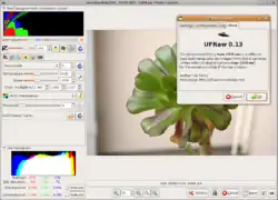 UFRaw (originally named after its founder Udi Fuchs's Raw, the backronym Unidentified Flying Raw replaced it as the full name) is an application which can read and manipulate photographs in raw image formats, as created by many digital cameras.[2] UFRaw is available as both as a stand-alone program and as a plugin for GIMP (only on non-Microsoft Windows systems). As a stand-alone program, UFRaw can be invoked with a graphical interface, or as a command line batch processing utility.[3]