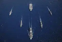 In the Gulf of Aden, the carrier strike group met with two US Navy task groups, Carrier Strike Group 5 headed by USS Ronald Reagan and USS Iwo Jima's Amphibious Ready Group.[49] The carrier strike group then exercised with the Indian Navy in the Bay of Bengal before exercising with the navies of Singapore, Malaysia and Thailand in the Strait of Malacca.[50][51] Finally, in the Indo-Pacific region, the strike group exercised with the Japanese Maritime Self-Defence Force and Republic of Korea Navy.[52]